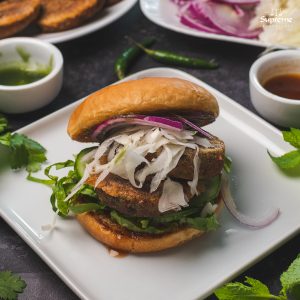 Serve. Place toasted buns on a plate. Spread tamarind sauce on the bottom bun and green chutney on the top bun.  Add lettuce to the bun then cucumber, 2 shami kebabs, cabbage and red onion. Add the top bun and serve.