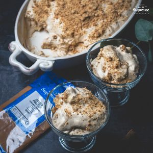 Into a large mixing bowl add double cream, sugar, vanilla extract and cinnamon powder. Whisk together until you have soft peaks. Add custard and sea salt and mix until well combined.