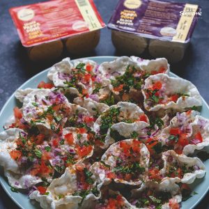 Top with chopped red onions, green chillies, tomatoes, coriander, chaat masala and lime juice. Serve immediately.