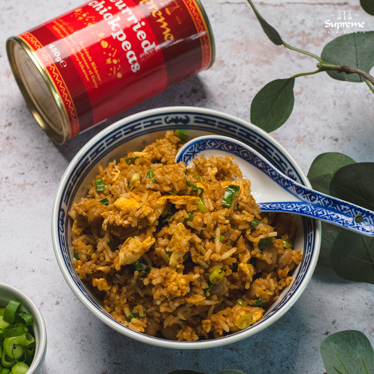 Perfect for busy weeknights – leftover rice stir-fried with eggs, spring onions, and a tin of supreme curried chickpeas. A quick, wholesome, and satisfying dish bursting with bold curry flavor.