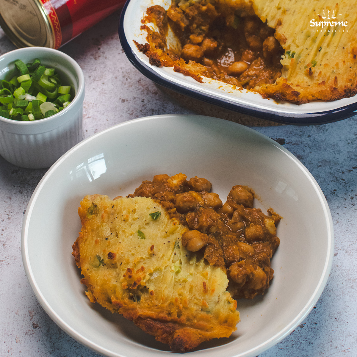 Create a hearty pie in no time! Warm a tin of Supreme Curried Chickpeas and pour into a baking dish. Top with creamy instant mash, spread evenly, and bake until golden. A quick, comforting dinner perfect for busy evenings.