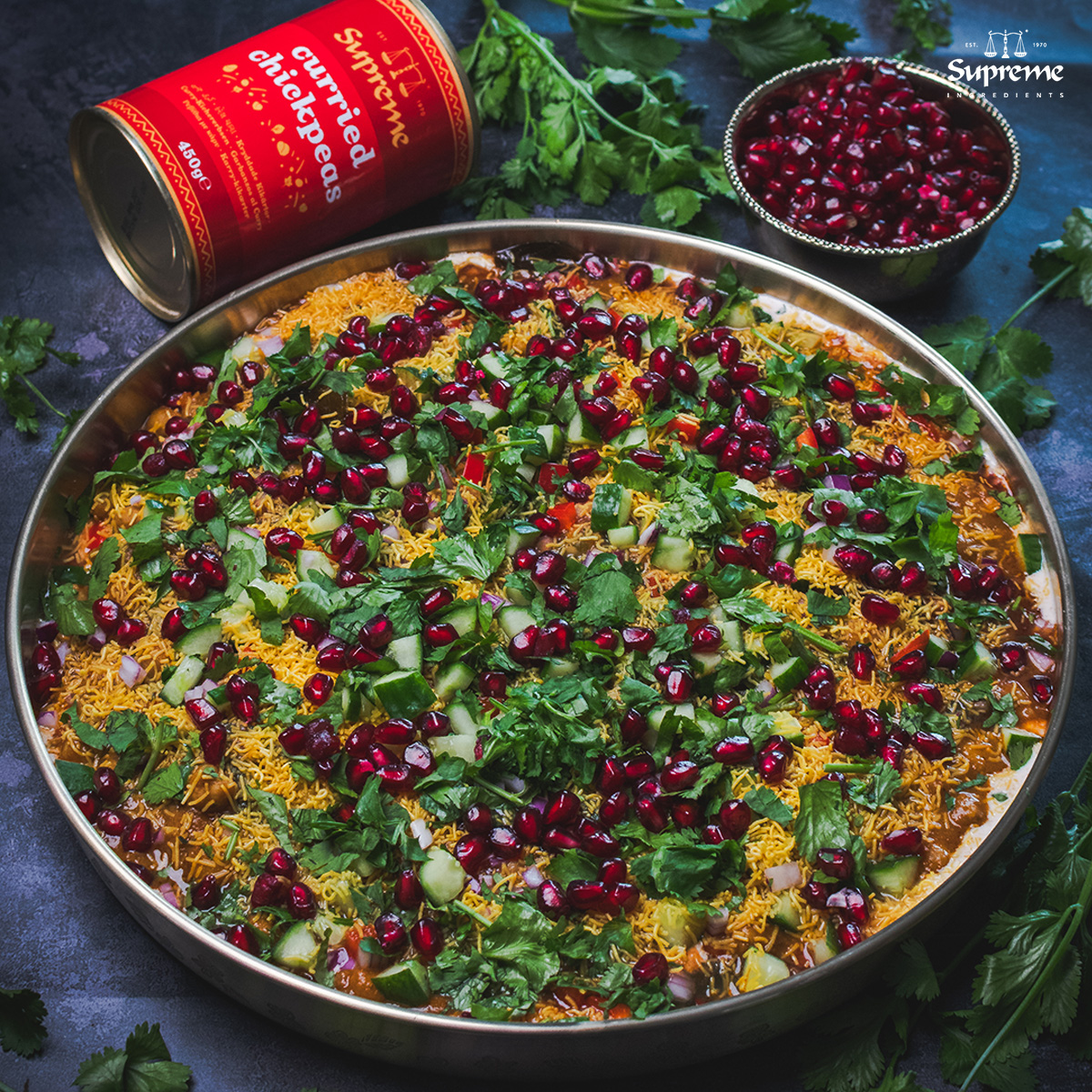 Chaat lovers, rejoice! Our Curried Chickpeas Chaat made with Supreme Curried Chickpeas is a vibrant medley of spicy chickpeas, crispy sev, garden-fresh cucumber, onions, zesty chutneys, and jewel-like pomegranate seeds. A true taste explosion!