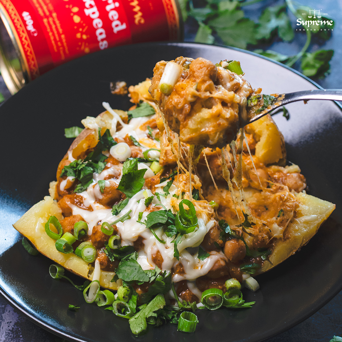 A British jacket potato meets Indian spice! Filled with rich, saucy curried chickpeas and topped with golden cheese, this recipe brings together homestyle comfort and the irresistible warmth of curry.