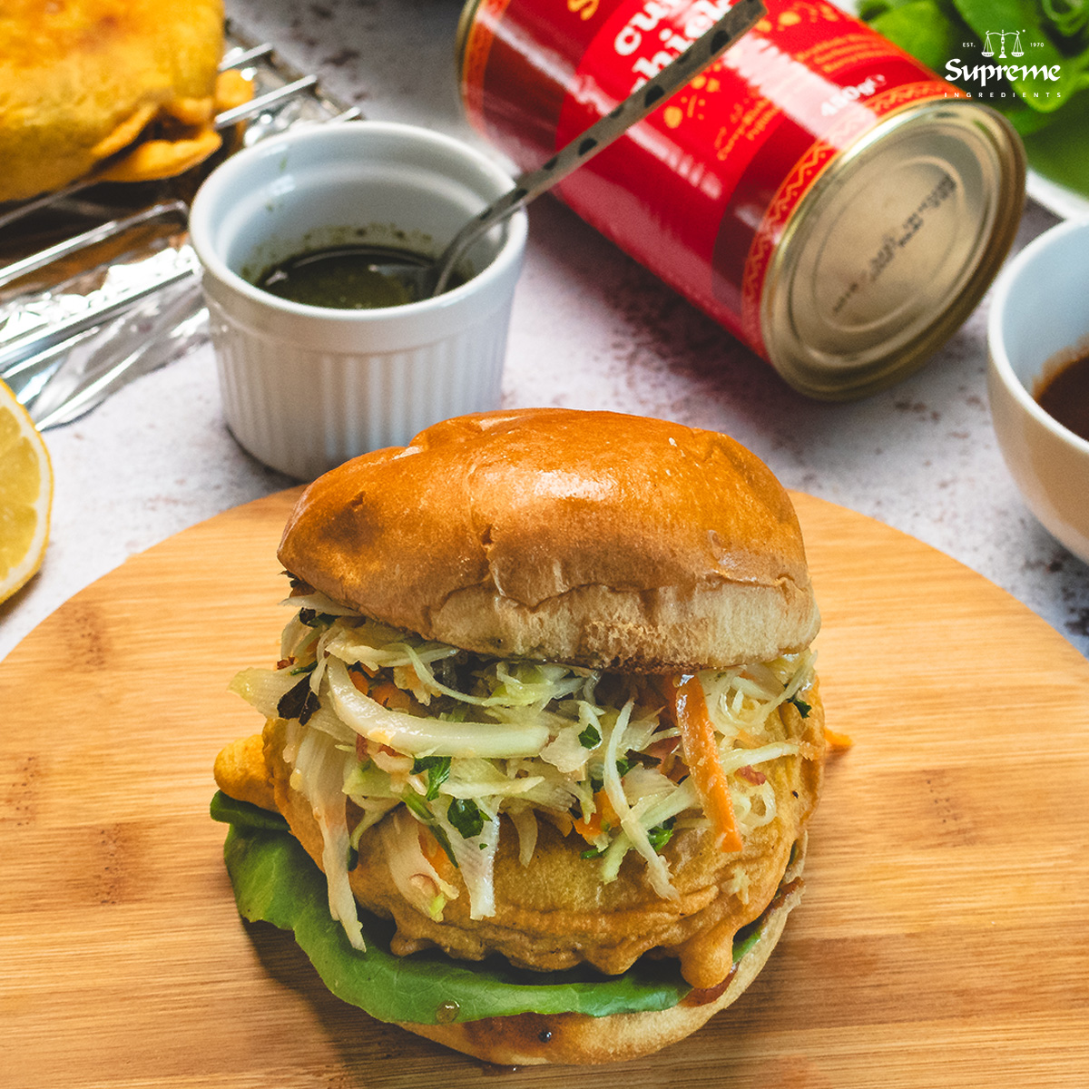 A desi twist to a classic favorite! This Curried Chickpeas Tikki Burger is made with spiced Supreme Curried Chickpeas patties, layered with crisp lettuce, zesty Indian slaw, tangy tamarind chutney, and refreshing green chutney, all hugged by soft toasted buns. A flavor-packed street food delight in burger form!
