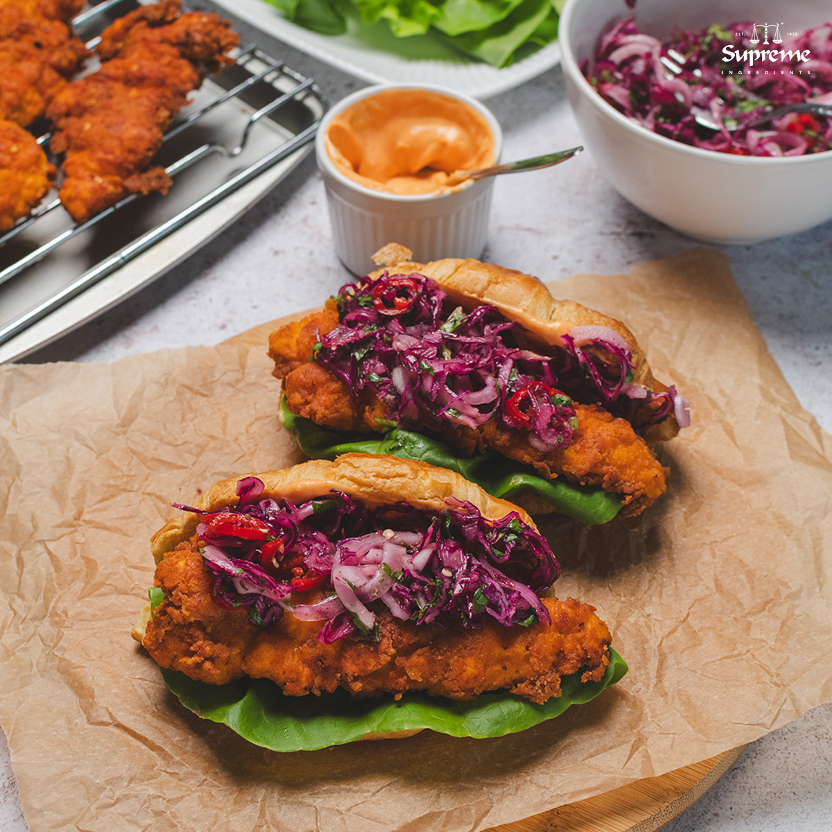 The ultimate sandwich glow-up: Flaky croissant, creamy sriracha mayo, crunchy chicken, zesty slaw—powered by Supreme Hot & Spicy Chicken Fry Mix!