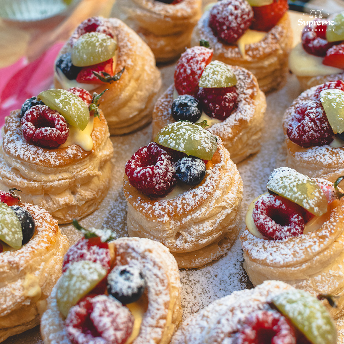 Beautifully baked vol-au-vents cradle a pillowy cloud of cardamom crème légère, elevated by a jewel-like medley of fresh fruit. Finished with a snowy dusting of icing sugar, these treats are almost too pretty to eat — almost