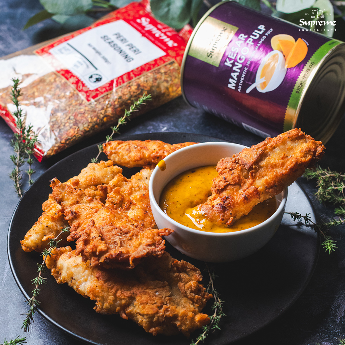 Serving up crunchy, juicy Buttermilk Chicken Tenders made with Supreme Chicken Fry Mix. Dip, bite, and enjoy!