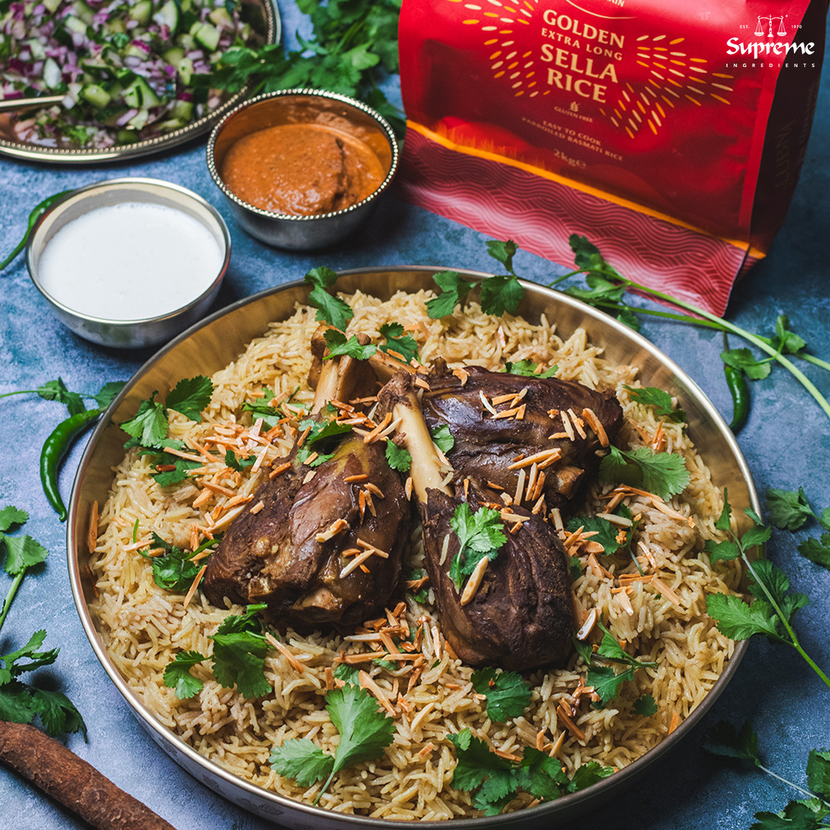 This Hawaij-spiced lamb shank dish is a love letter to Yemeni flavors! A slow-cooked masterpiece, infused with the bold, aromatic blend of supreme spices, it falls off the bone effortlessly. Paired with fluffy, long-grain Lubna Sella Rice, perfectly steamed and enriched with the flavorful drippings of the lamb, this dish is the ultimate comfort meal for Eid. A feast that brings family and tradition to the table in every bite!