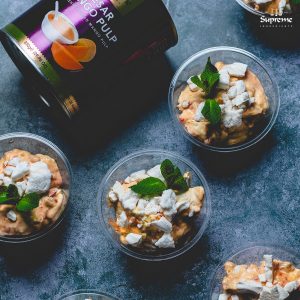 In another bowl add double cream, icing sugar and pinch of salt. Whisk together until you have soft peaks. Then crush 12 meringues into the bowl. Add the crushed raspberries and mango pulp. Then gently mix together until just combined. Spoon into serving dishes and crush the remaining meringues on top. Garnish with mint leaves and serve immediately.