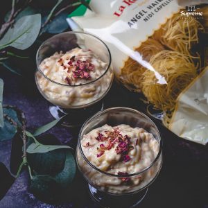 Heat a deep pot over medium heat. Add ghee and once melted add the crushed angel hair nests. Mix well to evenly coat in ghee and continue to cook until deep golden in colour. Add milk, stir well and bring to a boil. Once the milk comes to a boil add sugar and mix well until fully dissolved. Stir the milk and custard powder then pour into the milk. Continue to stir constantly until the custard thickens and is cooked through. Remove from heat and set aside to fully cool. Once cooled, refrigerate until chilled. Mix well before serving. Top with edible rose petals and serve.
